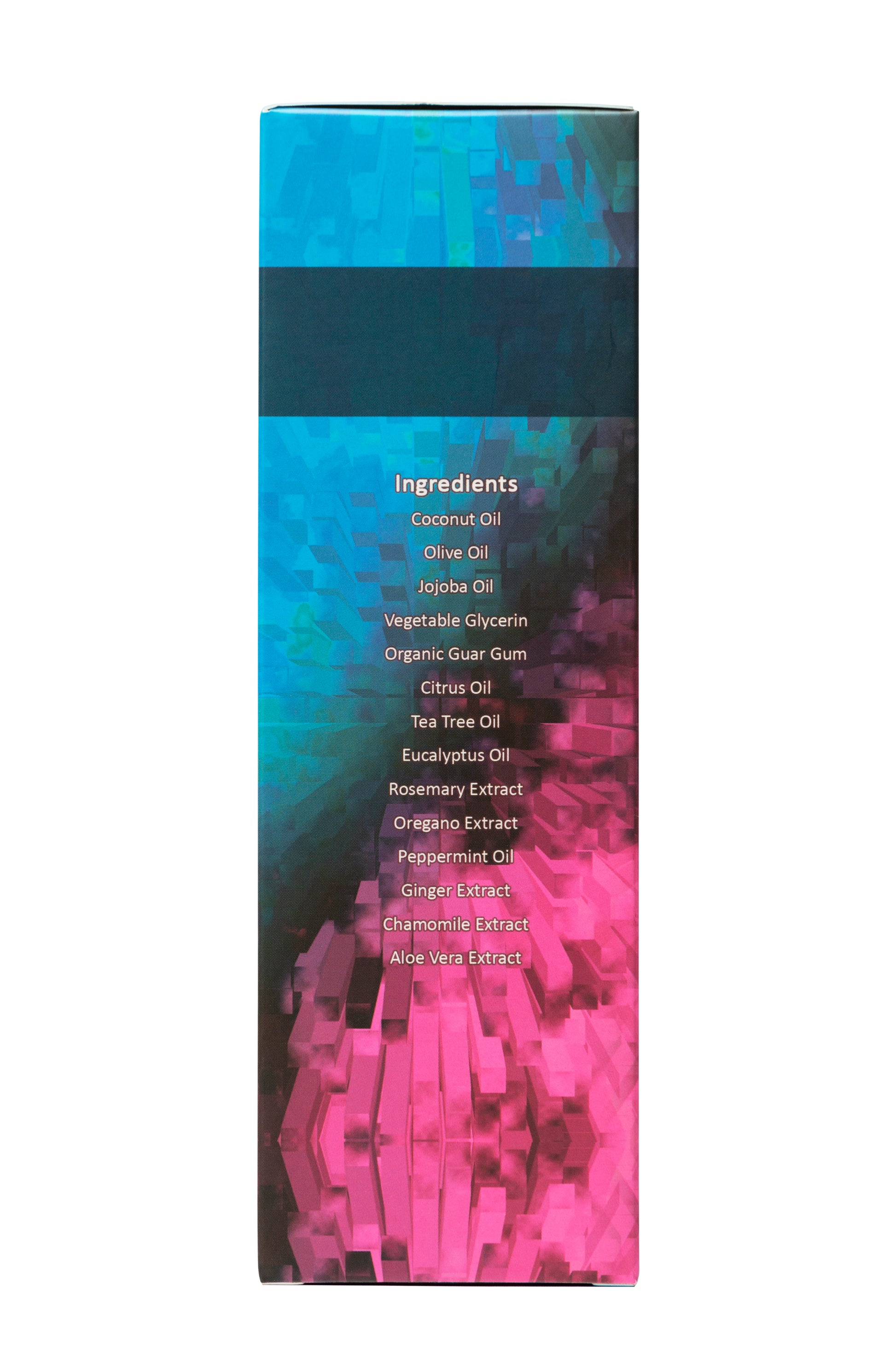 Coconut Oil, Olive Oil, Jojoba Oil, Vegetable Glycerin, Organic Guar Gum, Citrus Oil, Tea Tree Oil, Eucalyptus Oil, Rosemary Extract, Oregano Extract, Peppermint Oil, Ginger Extract, Chamomile Extract, Aloe Vera Extract